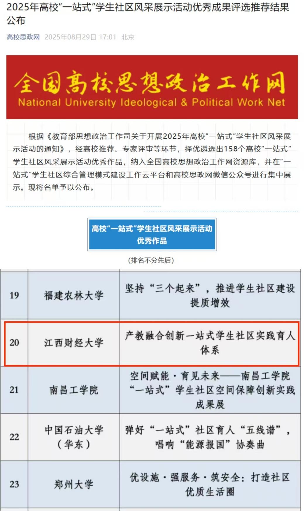 近日,教育部思想政治工作司公布2025年高校“一站式”学生社区风采展示活动优秀案例遴选结果,老虎机 报送的《产教融合创新一站式学生社区实践育人体系》案例成功入选(全校唯一),全省仅有7个案例入选。