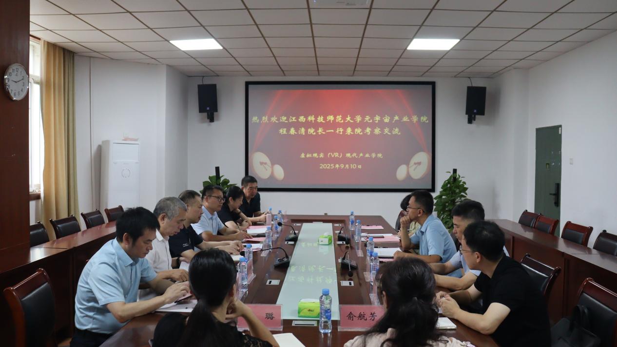 近日,江西科技师范大学元宇宙现代产业学院院长程春清、教务处副处长张豪及信息工程学院副院长詹华群及教务处副处长张豪一行莅临老虎机 ,就现代产业学院建设、中期检查验收、人才培养模式创新及校企协同机制等核心议题展开深入交流。老虎机 院长万征、院党委书记彭敏、院党委委员兼教务办主任吴洁、教研室主任舒雷、学工办主任姚春共同参与了此次座谈。