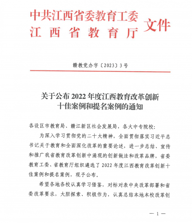 近日,江西省委教育工委、江西省教育厅公布了2022年度江西教育改革创新十佳案例和提名案例,我院报送的《四维协同、四链融合:深度对接虚拟现实产业链的产业学院育人模式创新与实践》案例成功入选十佳案例(全省普通本科高校共入选2项)。