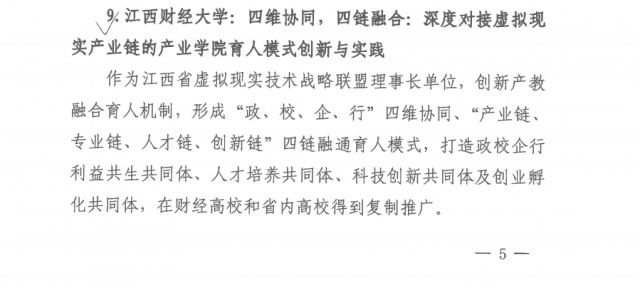学校作为江西省虚拟现实(VR)技术战略联盟理事长单位,主动服务地方战略产业,成立虚拟现实(VR)现代产业学院,探索产教融合人才培养新模式,形成了“政、校、企、行”四维协同,“产业链、专业链、人才链、创新链”四链融合的育人模式,与政府、企业、行业协会联合打造人才培养共同体、科技创新共同体、创业孵化共同体及利益共生共同体,在财经高校和省内高校得到复制推广。