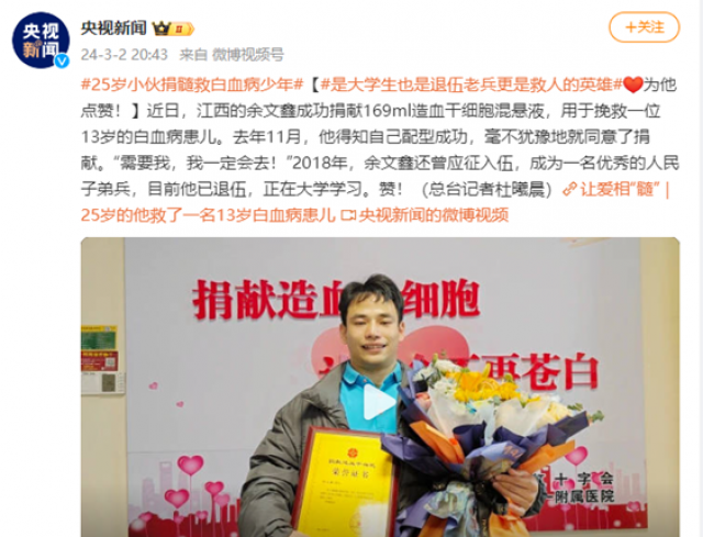 据介绍,余文鑫,1999年出生,2018年响应国家号召,应征入伍,成为一名优秀的人民子弟兵。2023年,他以优异成绩通过专升本考试,现就读于虚拟现实(VR)现代产业学院,是一名优秀的江财学子。2020年11月,他加入了中华骨髓库,成为一名造血干细胞捐献志愿者,希望有机会为别人带来生命曙光。